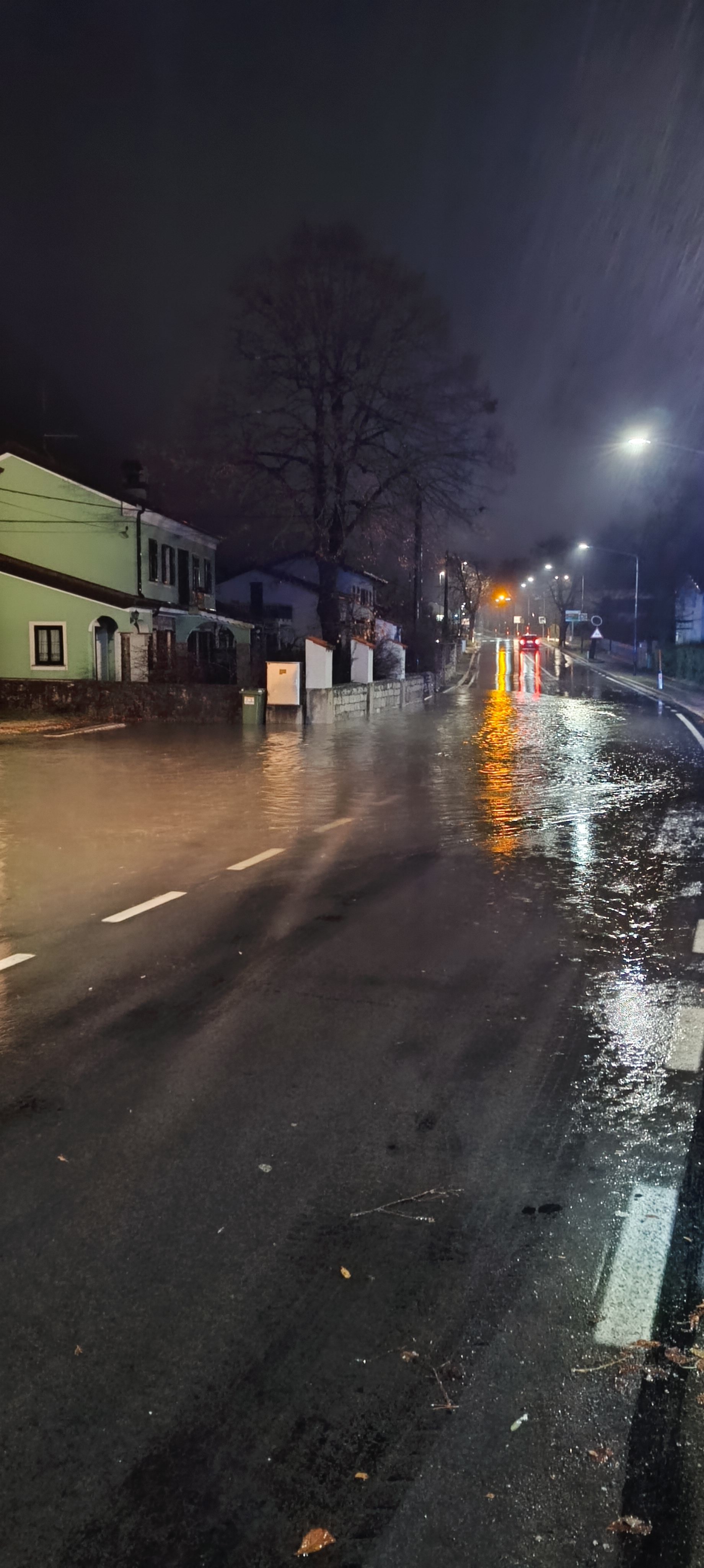 Na Reški cesti v Hrpeljah je zaradi močnega dežja in zamašenih jaškov, voda poplavila dvorišče pred več stanovanjskim objektom ter glavno cesto.